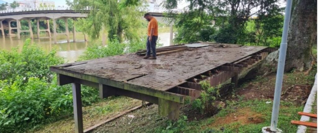 A Secretaria de Proteção e Defesa Civil, em parceria com a Secretaria de Serviços Públicos e Zeladoria e com apoio da Polícia Municipal, iniciou nesta terça-feira (3) os trabalhos de recuperação do deck instalado na margem do Rio Tubarão, na Avenida Marechal Deodoro.