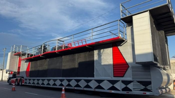 Reconhecido nacionalmente pela potência sonora, tecnologia embarcada e qualidade técnica, o trio possui 24 metros de comprimento, até 5,80 metros de altura e avanço lateral que amplia ainda mais sua estrutura. O sistema de áudio de alta performance tem capacidade estimada entre 150 mil e 180 mil watts, distribuídos entre frente, laterais e traseira, garantindo cobertura sonora uniforme, clareza e impacto mesmo em grandes concentrações de público.